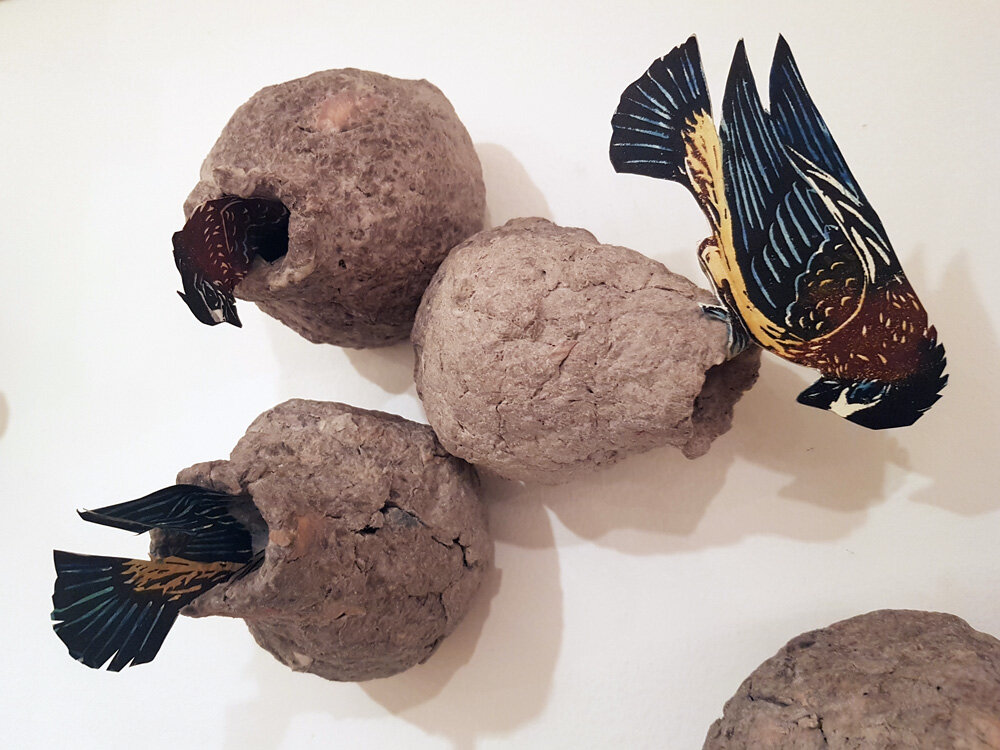Despite the harshness of the Yukon climate, there is a huge array of birds - resilient, tough, light and free. Many live here year-round while others are passing through on migratory routes or arrive here to breed. These tiny residents of the boreal forest have inspired me to set my prints free from the usual confines of 2-dimensional art. What began as little paper birds flying has turned into complex creations of 3-dimensional birds perched on branches or stumps- creating a paper world.